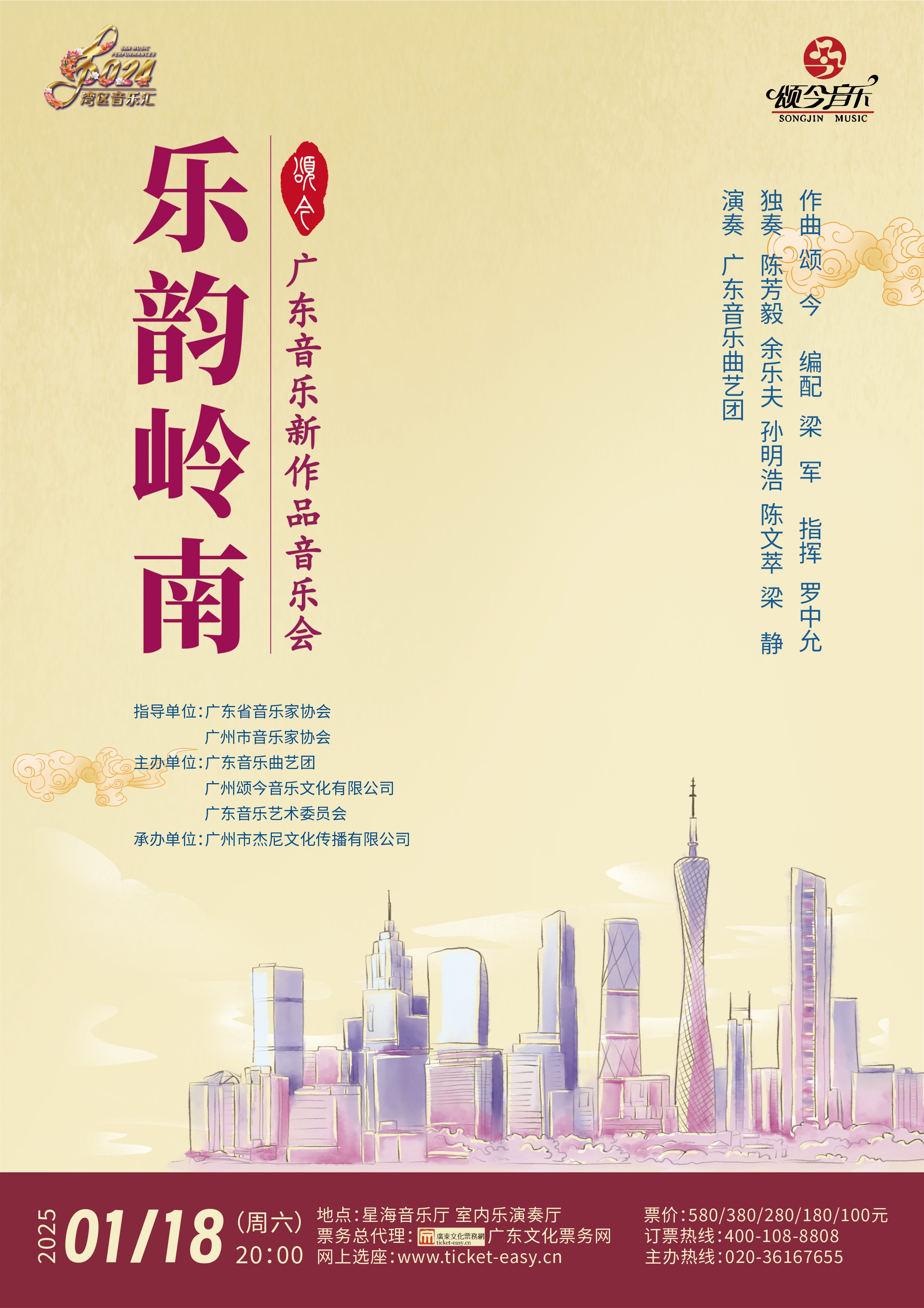 《乐韵岭南》音乐会展现岭南新时代风貌的广东音乐作品,特邀著名作曲家吴颂今创作曲目,并由作曲家梁军进行编配。广州岭南交响乐团音乐总监罗中允指挥,著名管乐演奏家、国家一级演奏员陈芳毅,著名高胡演奏家余乐夫,青年箫笛演奏家孙明浩,粤乐琵琶演奏家、国家一级演奏员陈文萃等,与广东音乐曲艺团大乐队共同担纲演出。