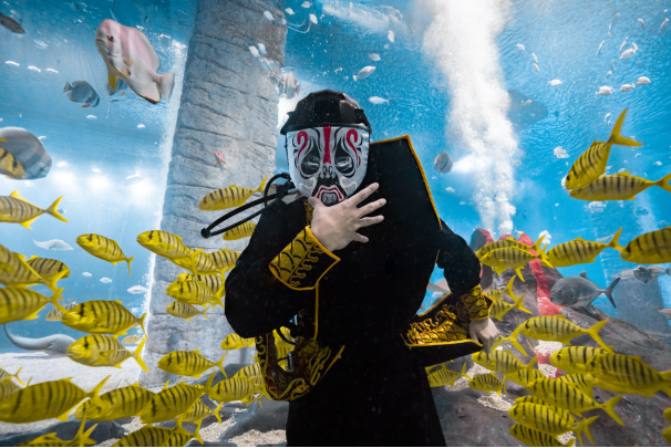 国庆中秋期间,美人鱼演出《深海国戏》水下非遗大秀将在正佳极地海洋世界开演。在40米宽的吉尼斯世界纪录展缸里,东方美人鱼身着刀马旦戏服、手拿戏曲花枪,水下演绎中国功夫,中间加入传统川剧变脸环节,完美展示奇幻与艺术结合的东方魅力。火爆全网的美人鱼秀《青白缘起》演出也将继续精彩上演,还有独特的水下升旗仪式,让前来过节的游客过一个仪式感满满的国庆节。