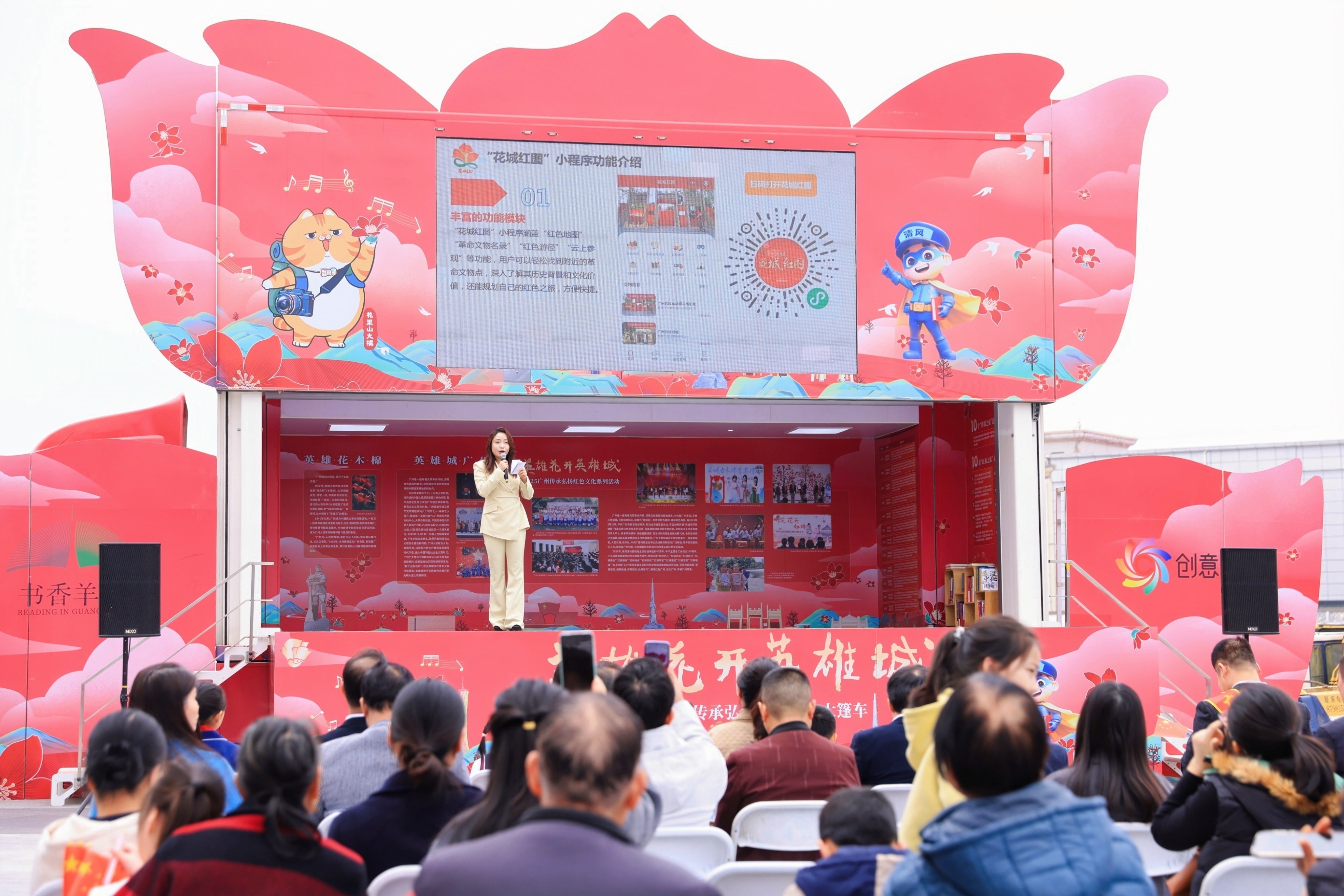 首场活动一经启动,便吸引了大量市民前来参与,现场人头攒动,气氛热烈。红色文化大篷车成为全场焦点!通过5分钟的大篷车舞台展示,结合视频、PPT讲解和现场互动,向市民们全方位介绍了“花城红+”品牌、“花城红图”小程序的使用方法。市民们纷纷与主持人互动,现场气氛热烈,大家对红色文化的兴趣被瞬间点燃!