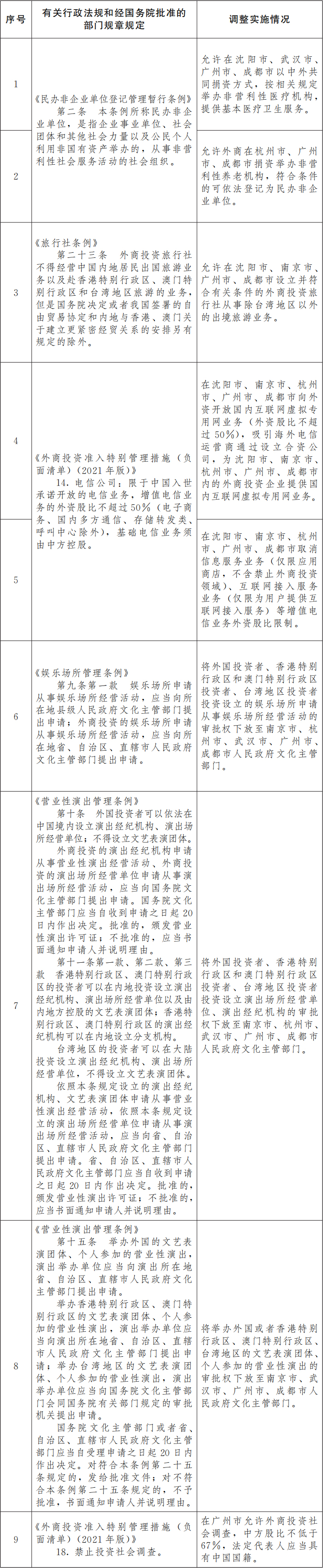 国务院关于同意在沈阳等6个城市暂时调整实施有关行政法规和经国务院批准的部门规章规定的批复 国函〔2024〕110号 辽宁省、江苏省、浙江省、湖北省、广东省、四川省人民政府,商务部、司法部: 你们关于在沈阳市、南京市、杭州市、武汉市、广州市、成都市暂时调整实施有关行政法规和经国务院批准的部门规章规定的请示收悉。现批复如下: 一、按照《国务院关于同意在沈阳等6个城市开展服务业扩大开放综合试点的批复》(国函〔2022〕135号),同意自即日起,在沈阳市、南京市、杭州市、武汉市、广州市、成都市等6个服务业扩大开放综合试点城市暂时调整实施《民办非企业单位登记管理暂行条例》、《旅行社条例》、《娱乐场所管理条例》、《营业性演出管理条例》、《外商投资准入特别管理措施(负面清单)(2021年版)》的有关规定(目录附后)。 二、国务院有关部门、相关省市人民政府要根据上述调整,抓紧对本部门、本省市制定的规章和规范性文件作相应调整,统筹发展和安全,建立与服务业扩大开放综合试点任务相适应的管理制度。 三、商务部要会同有关部门、相关省市人民政府对上述调整实施情况及时组织评估,在相关城市试点任务结束前及时商司法部研提后续工作建议,稳定经营主体预期,保障工作有序衔接。 国务院将根据相关城市服务业扩大开放综合试点情况,适时对批复内容进行调整。 附件:国务院决定在沈阳等6个城市暂时调整实施的有关行政法规和经国务院批准的部门规章规定目录.jpg 国务院 2024年7月8日 |