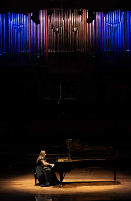 音乐会的下半场更是高潮迭起。瓦伦廷娜演奏了由李斯特改编的贝多芬著名交响曲《第三交响曲“英雄”》。这部结构宏大的作品原本为整个管弦乐队而作,改编为钢琴独奏后,对演奏者的技巧和体力都是极大的考验。瓦伦廷娜以她标志性的强劲力度和清晰流畅的演奏,将交响乐般的辉煌气势完美再现于钢琴之上,尤其是最后乐章,音乐如同盛大的凯旋典礼,气势磅礴,令人热血沸腾,为下半场画上了一个圆满的句号。